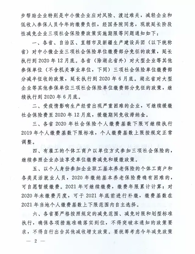 六、 各省要严格按照规定的减免范围、减免时限和划型标准执行,确保各项措施准确落实到位,不得突破本通知的政策要求,不得自行出台其他减收增支政策。要统筹考虑今年减免政策等因素,按程序调整2020年社保基金收支预算。