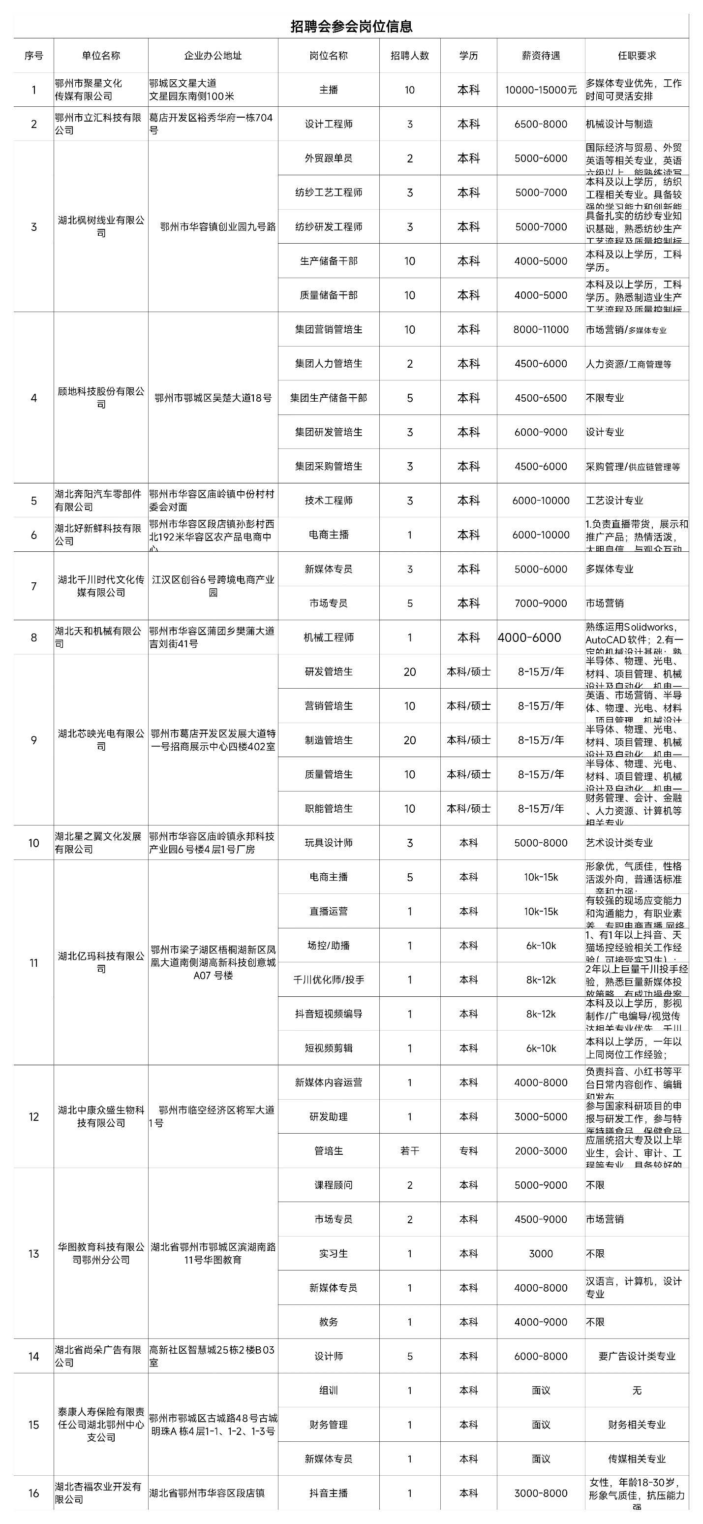 10月16日下午14:00,华容区人社局牵头,联合区劳动就业中心、湖北武东人力资源产业园,组织区内16家重点企业赴武汉纺织大学南湖校区,参与“‘才聚荆楚 共建支点’就业促进专项行动暨‘学子聚汉’工程武汉纺织大学专场招聘会”,以“专业对口+服务下沉”实现校企供需高效匹配。