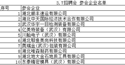 2025年3月7日湖北武东人力资源产业园组织区内10家重点企业举办招聘会,10家企业如下