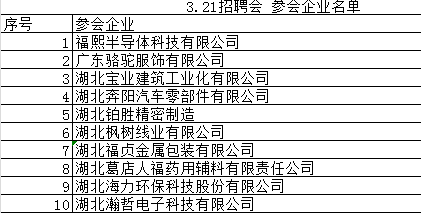 2025年3月21日湖北武东人力资源产业园组织区内10家重点企业举办招聘会,10家企业如下